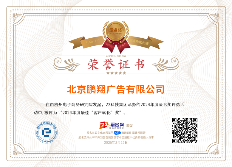 当前位置:爱名奖 > 2024年度最佳“客户转化”奖获奖名单>北京鹏翔广告有限公司